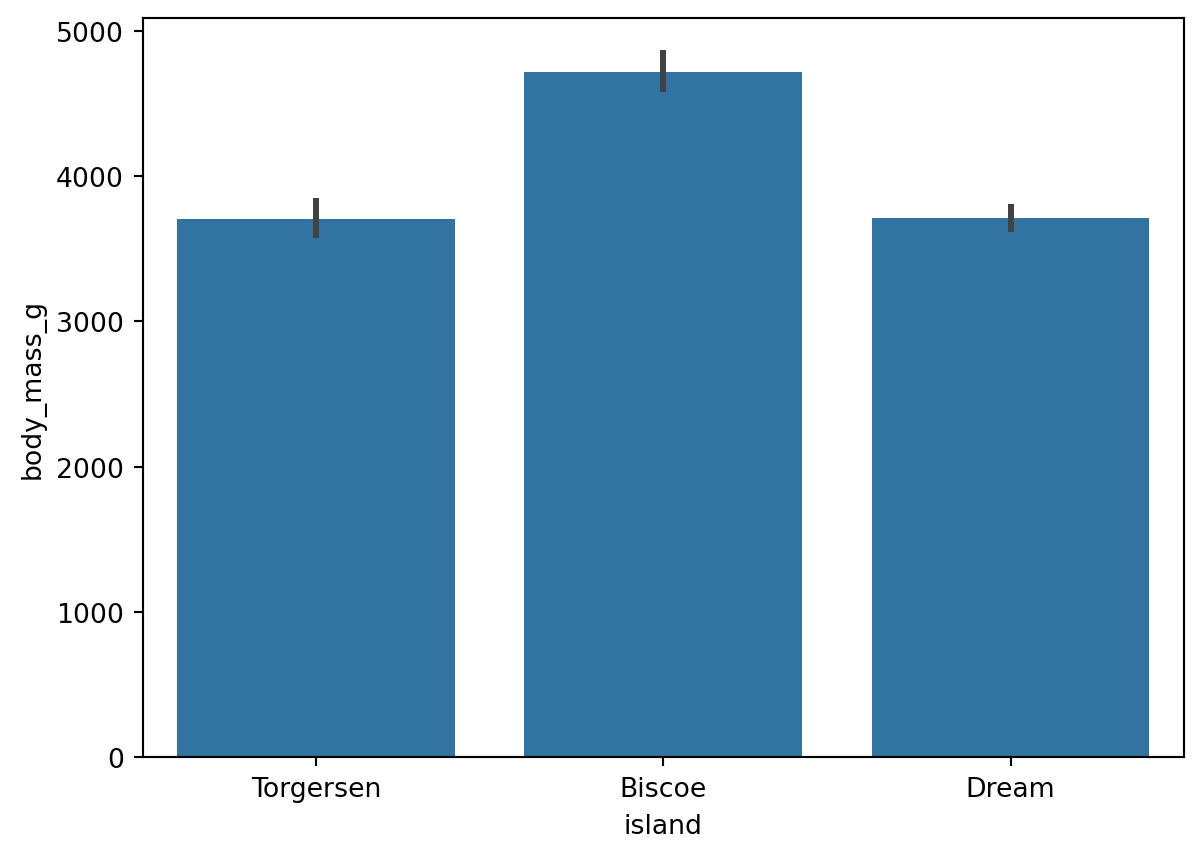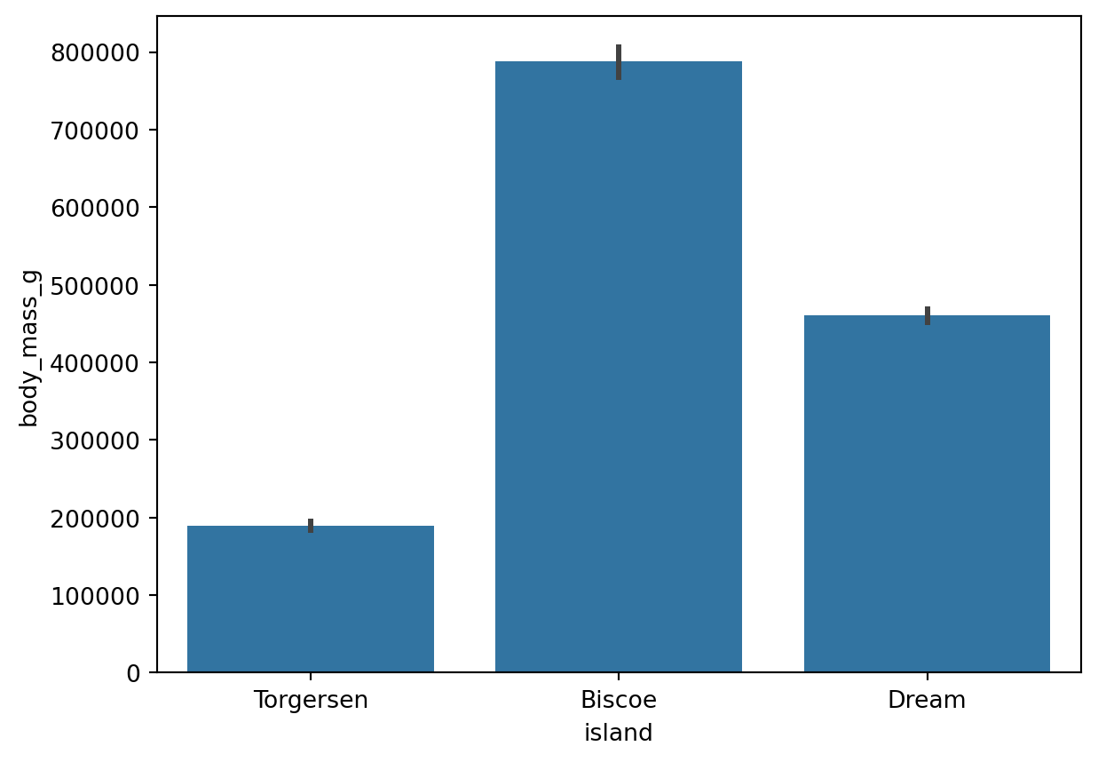 sns.barplot(data=df, x='island', y='body_mass_g') #⭐1