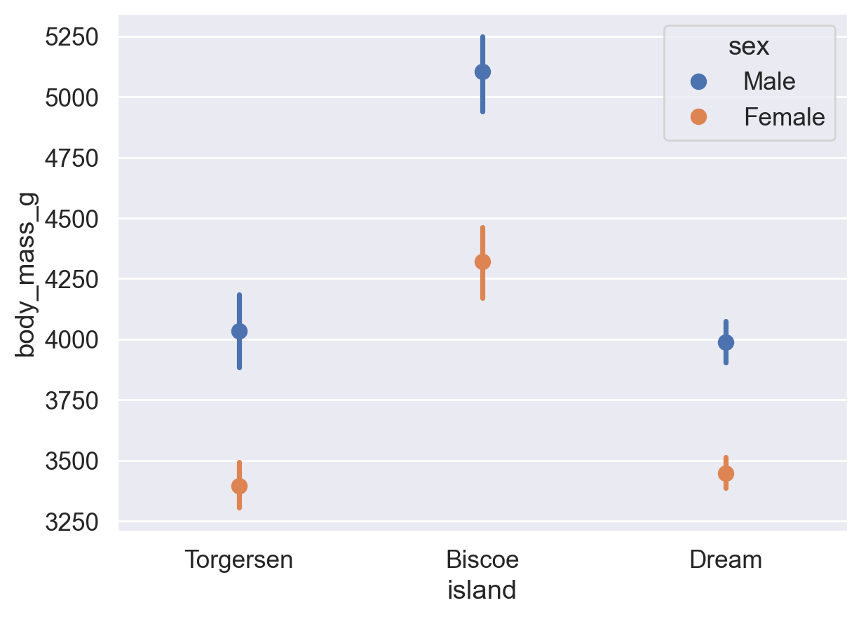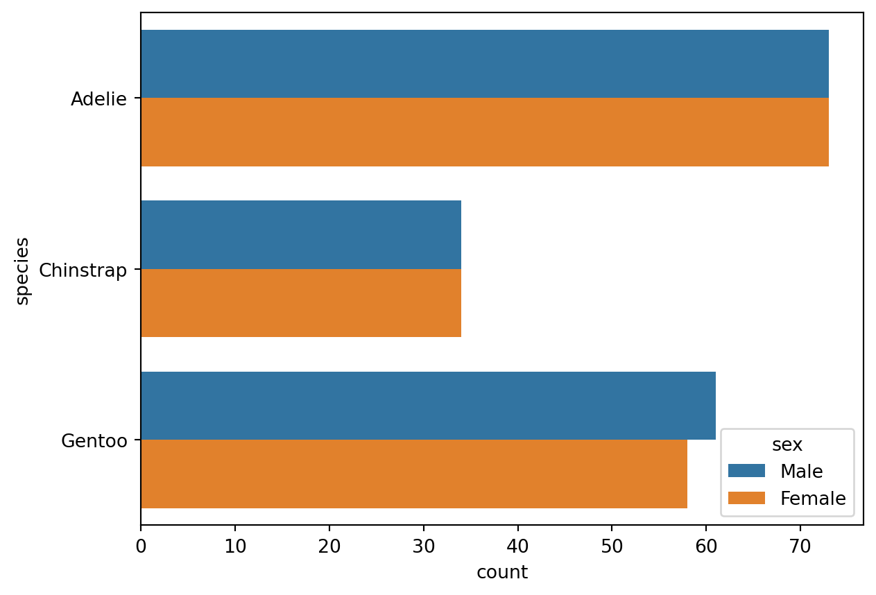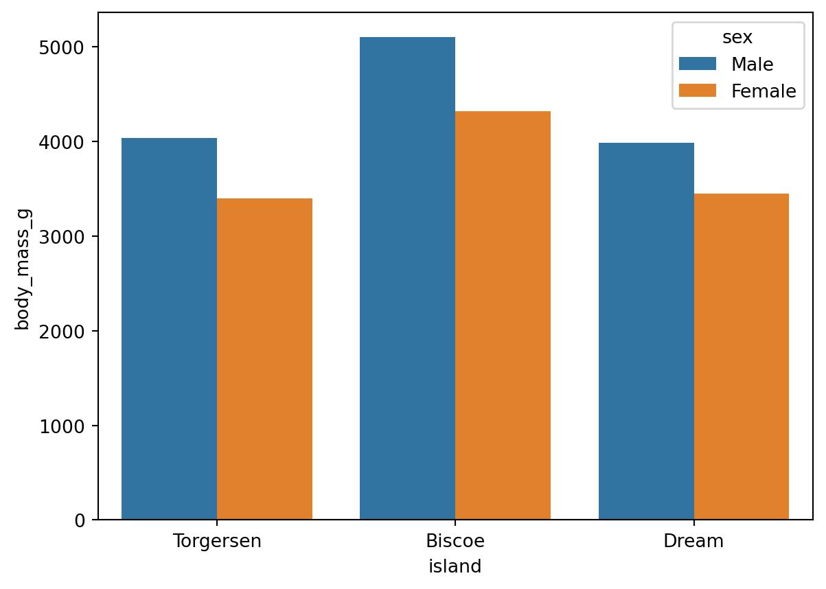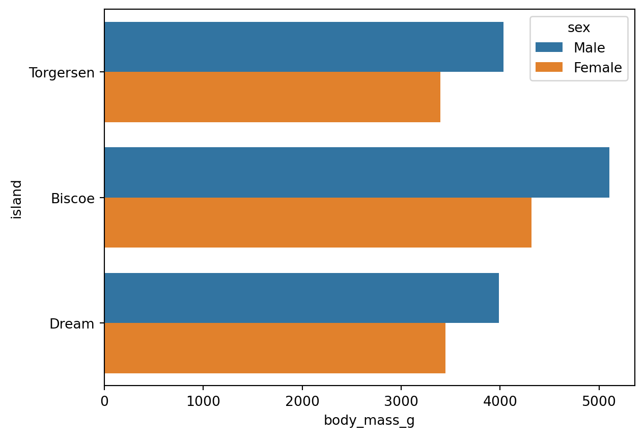 df.head() # show the first 5 rows of df| species | island | bill_length_mm | bill_depth_mm | flipper_length_mm | body_mass_g | sex | |
