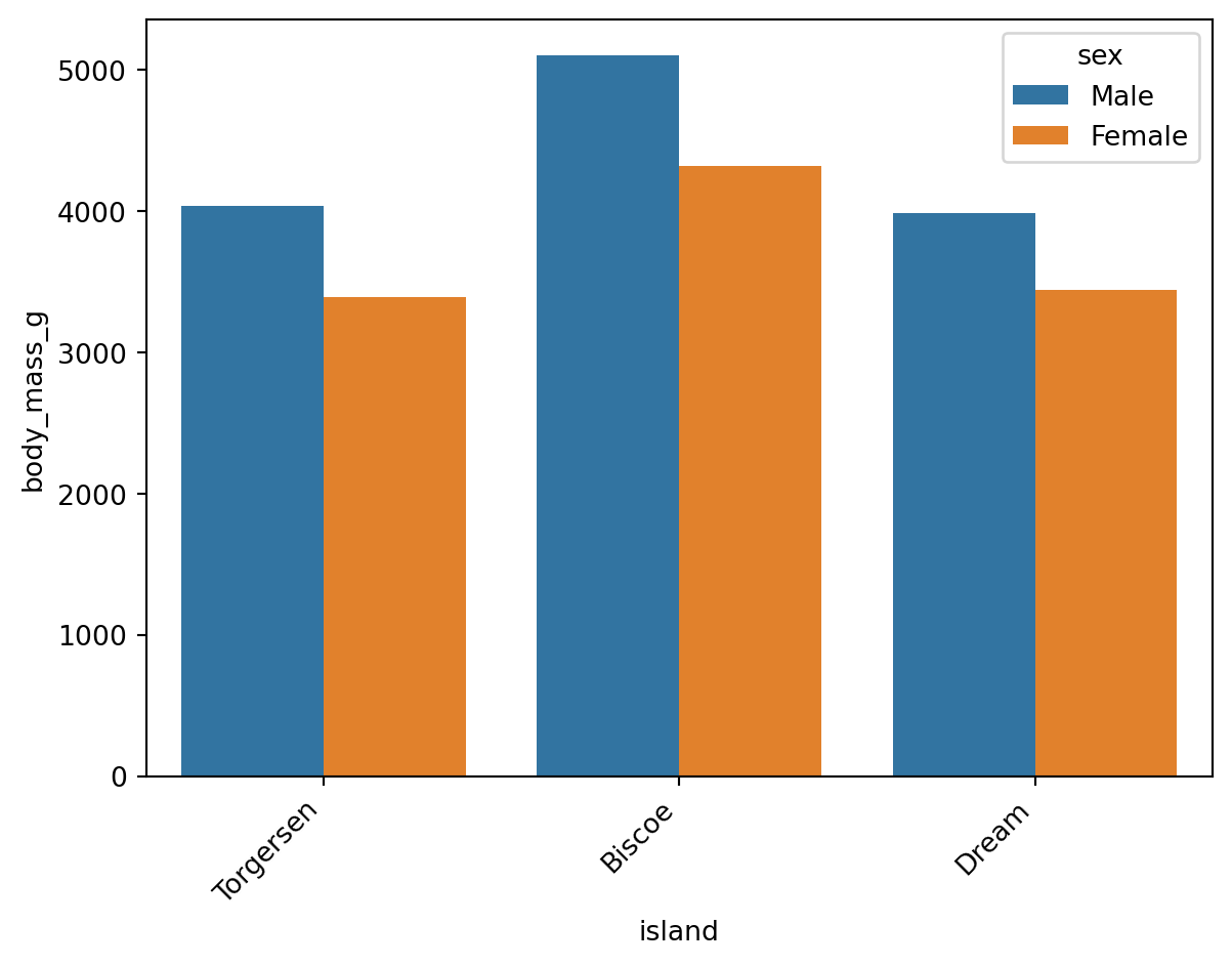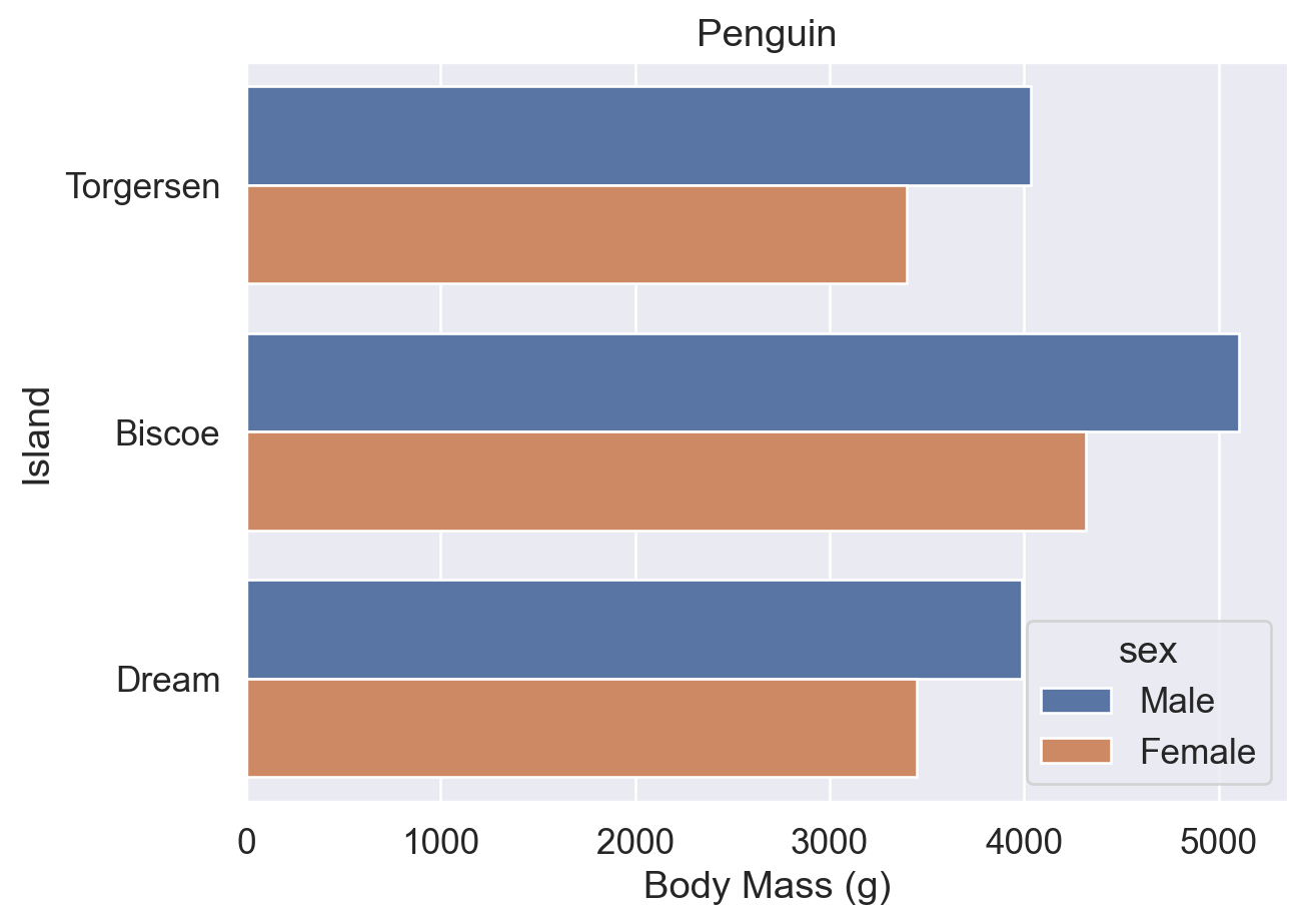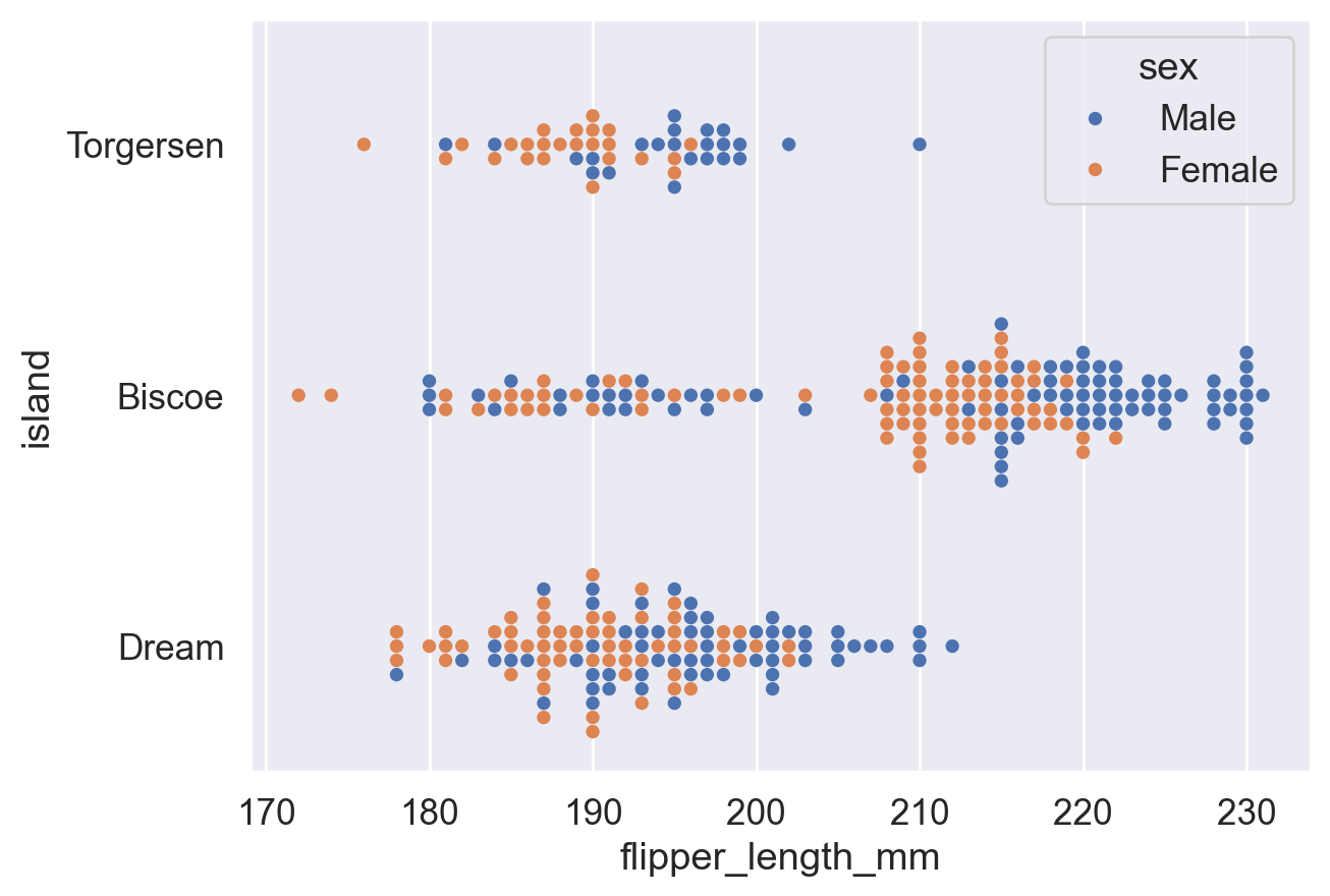 df.head() # show the first 5 rows of df| species | island | bill_length_mm | bill_depth_mm | flipper_length_mm | body_mass_g | sex | |