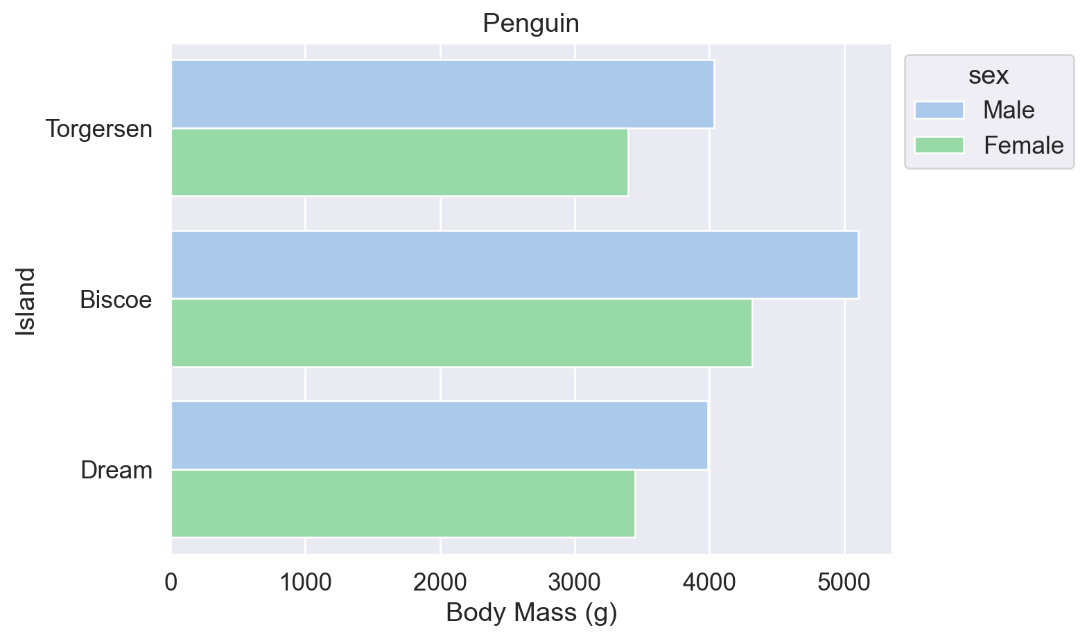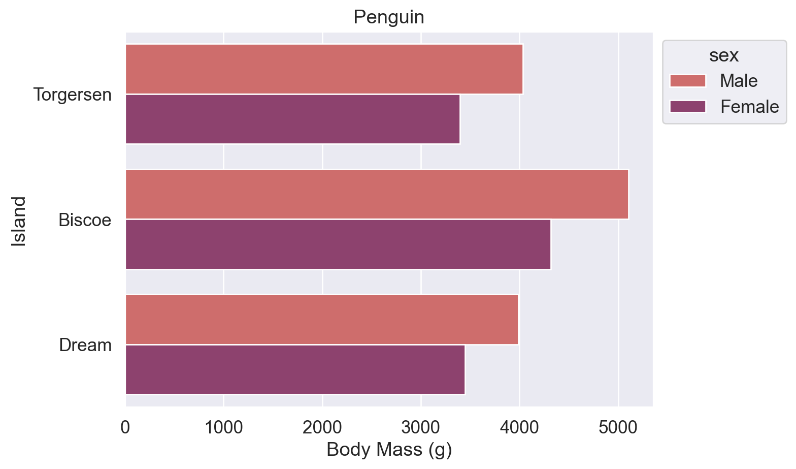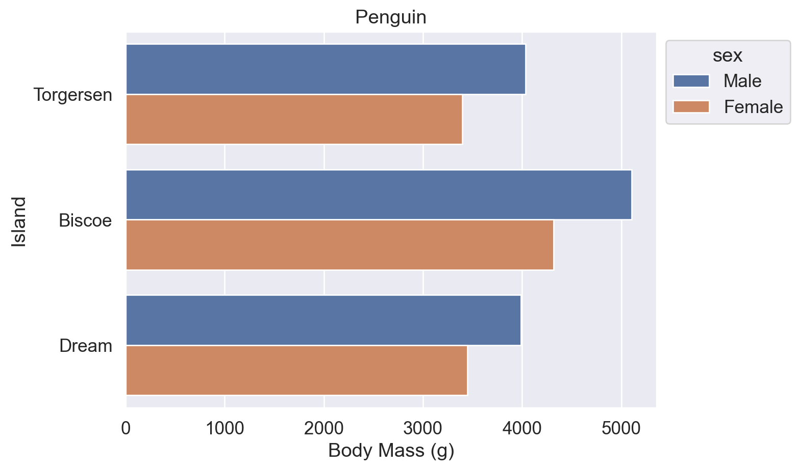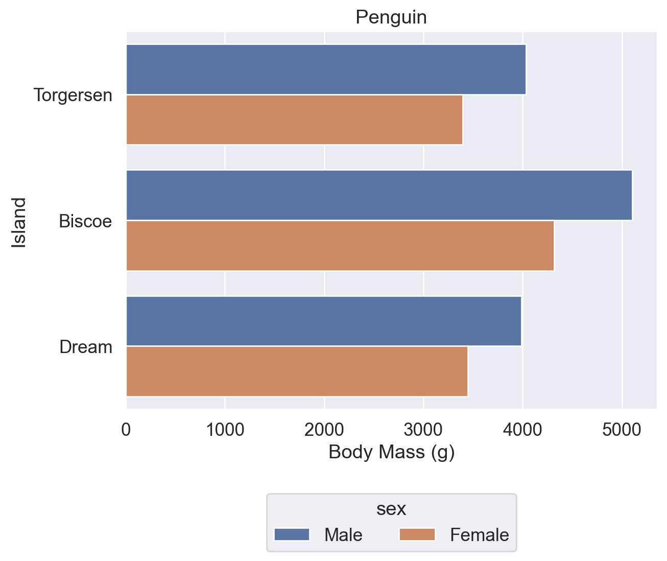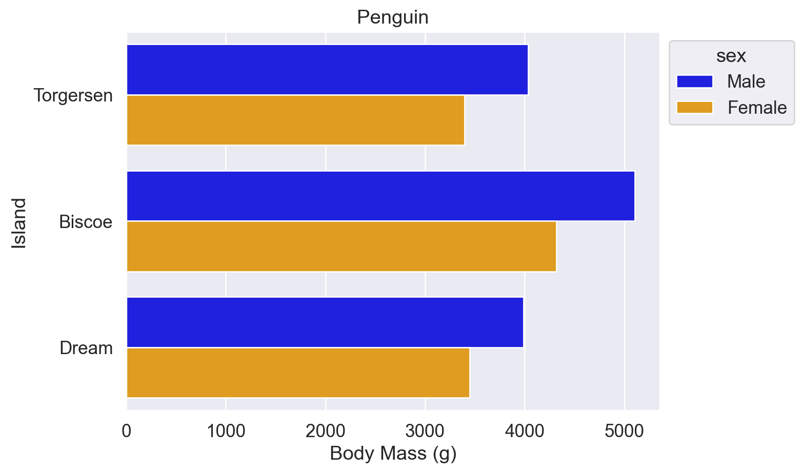 # 因为【Biscoe岛】这个 category 下的【体质量】amount 有多个数值,调用 sns.barplot() 函数画图时默认取了平均值,并显示了误差范围(黑线)。4716.017964071856