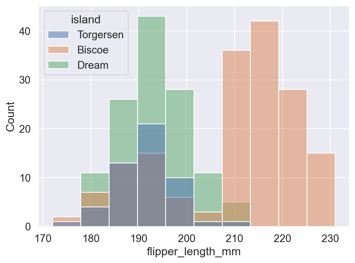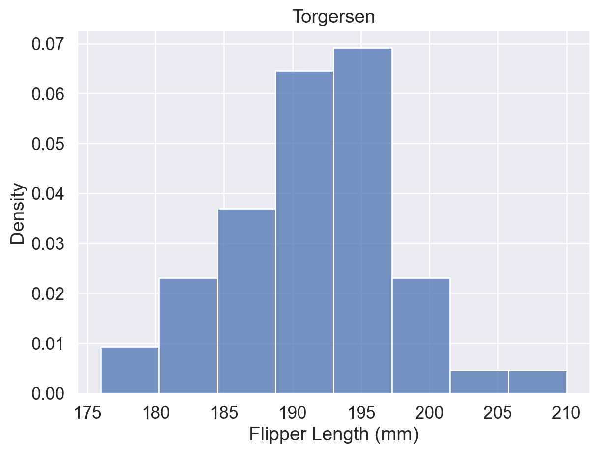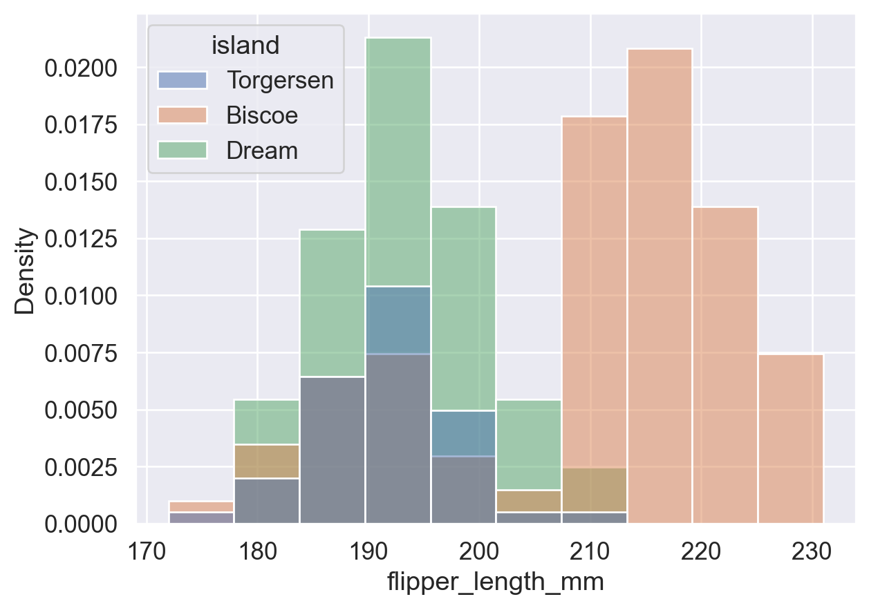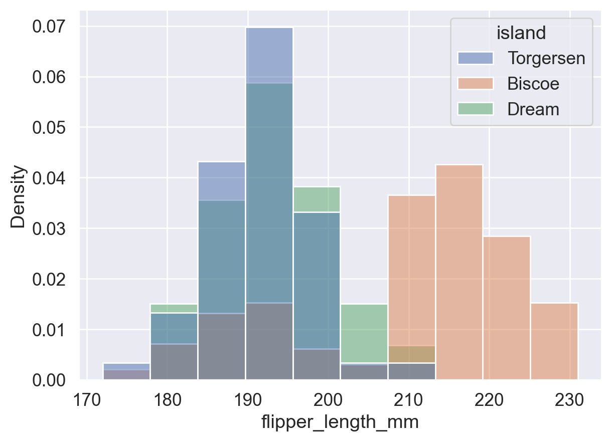 # 即,所有蓝色的 bins (Torgersen岛) 面积总和加起来为 1;