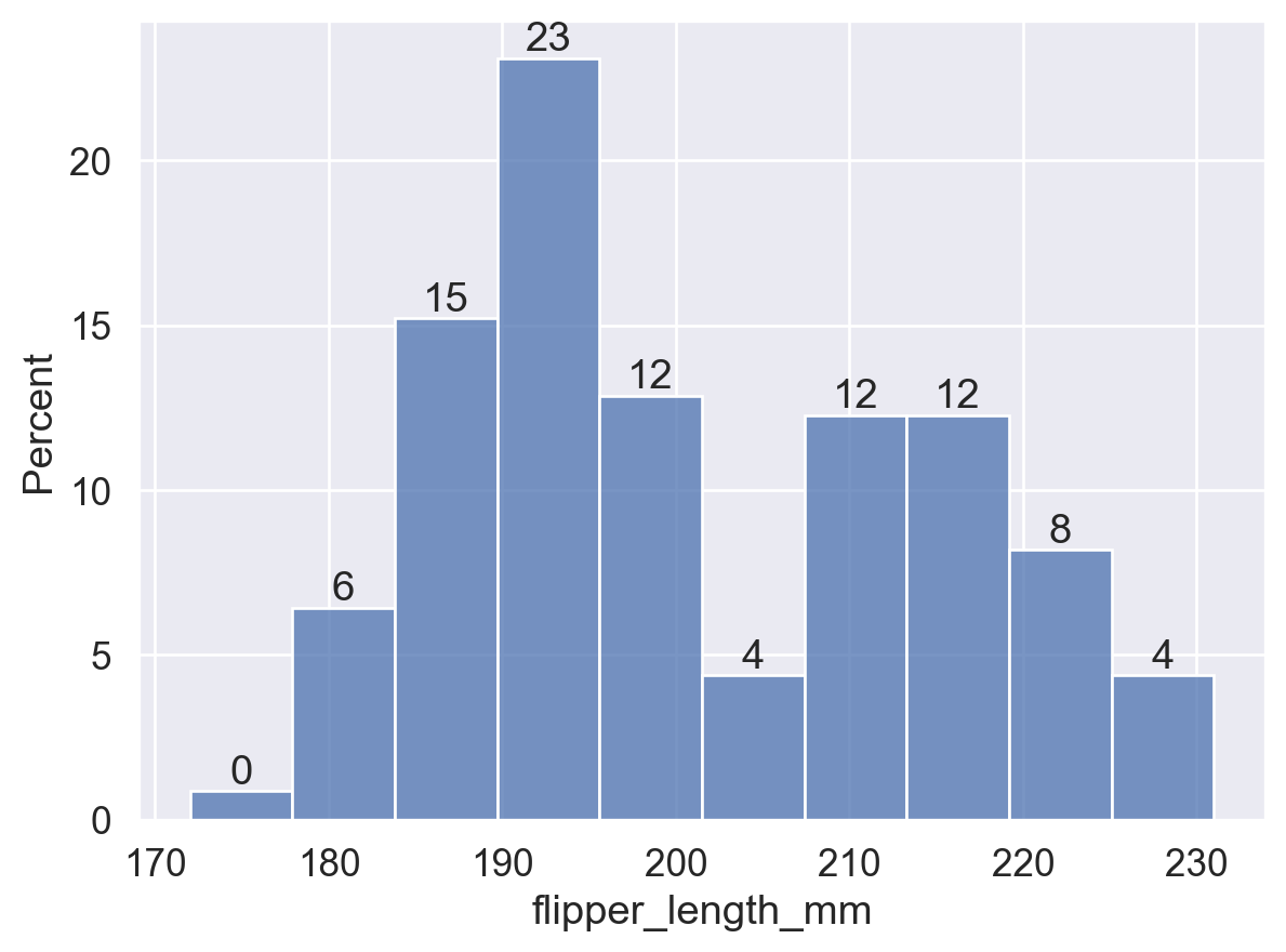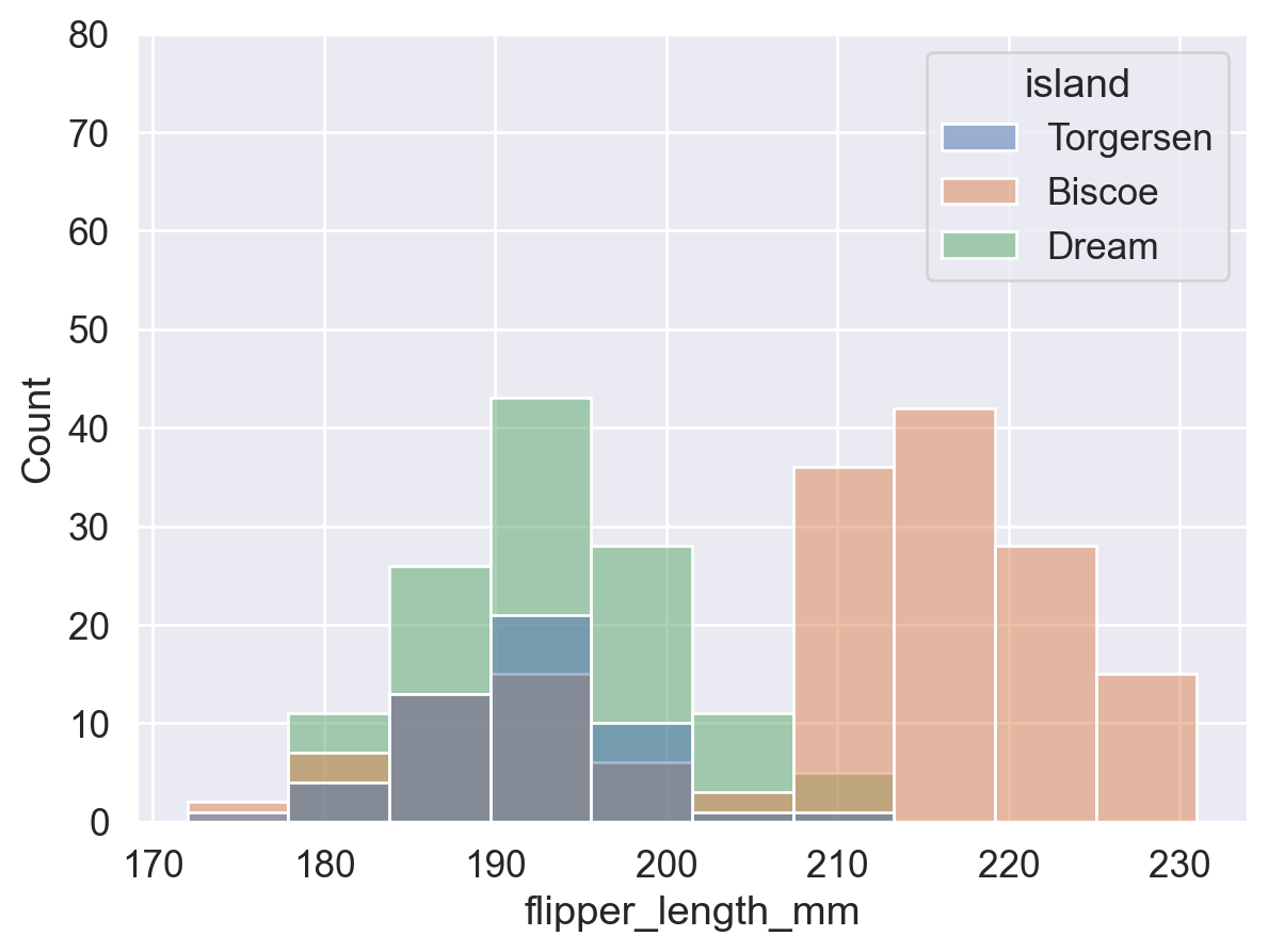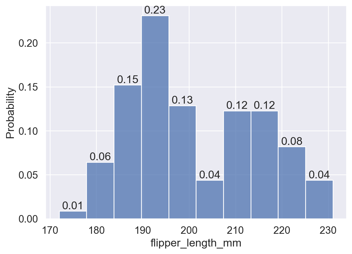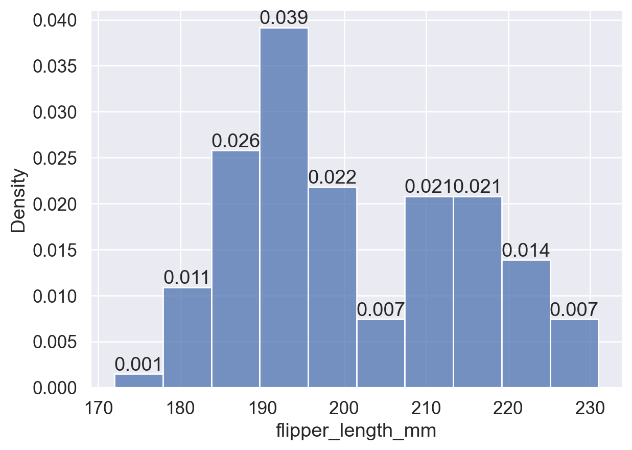 # 即,所有蓝色的 bins (Torgersen岛) 面积总和加起来为 1;
