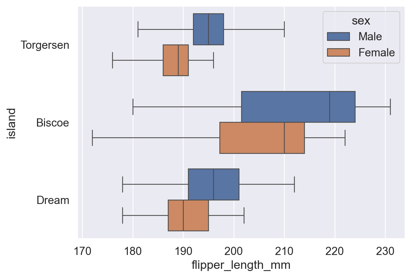 #👆绘制不同岛屿上雌雄企鹅各自的箱线图