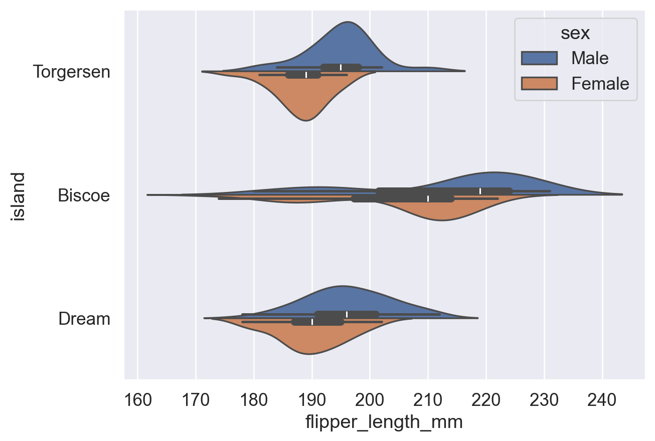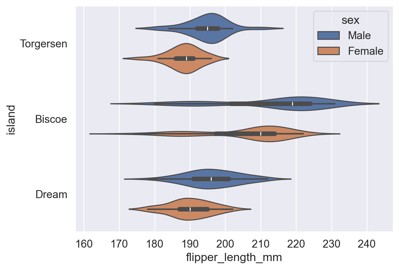 sns.violinplot(data=df, y='island', x='flipper_length_mm', hue='sex')
