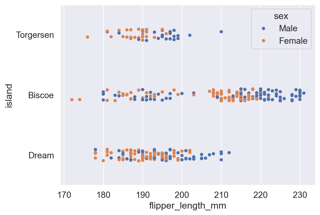 sns.stripplot(data=df,x='flipper_length_mm',y='island',hue='sex')