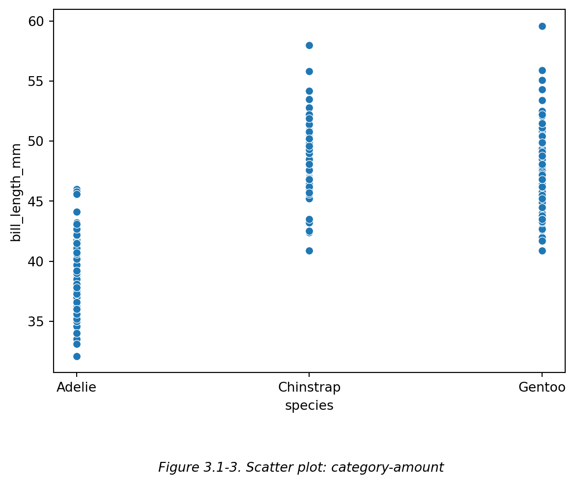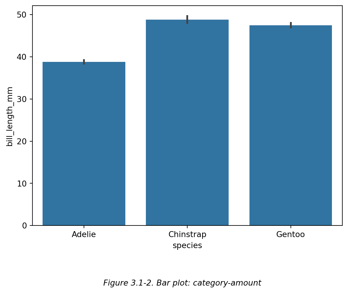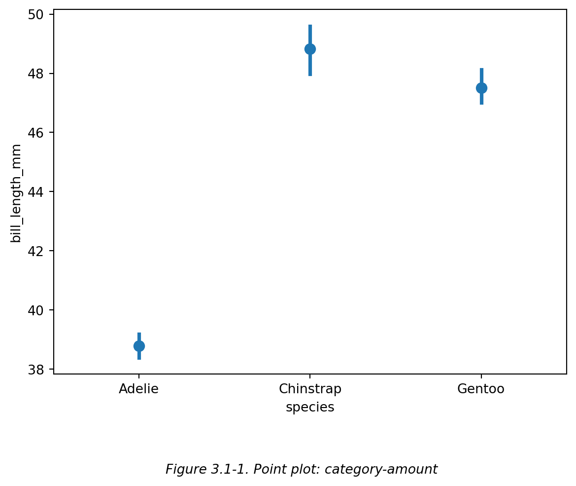 如上面两图 (Figure 3.1-1 和 Figure 3.1-2) 所示,点图 (point plot) 和 柱状图 都可以表示企鹅 企鹅种类-喙长 的关系,其中企鹅种类是 categorical data,而喙长是 numerical data,即 category-amount 的关系。这两种图的区别之一是,柱状图的 amount 必须从 0 开始,点图不需要从 0 开始。