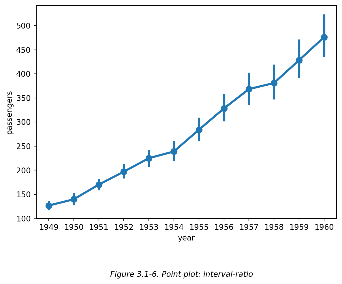点图 (point plot) 的另一个特点是点与点之间可以连线,适用于横轴为 ordinal 或 interval data 数据的展示。因为当横轴刻度的顺序有意义时,连线才有讨论价值。比如下图 (Figure 3.1-6) 的年份即为 interval data,年份逐渐增加,连线可以表示年平均乘客量遂年份增加的变化趋势;而上面 Figure 3.1-1 中的点图的横坐标为企鹅种类,是 norminal data,其顺序没有意义,因此没有画连线。
