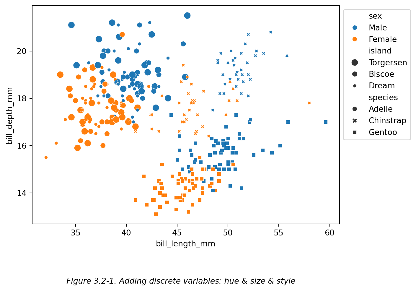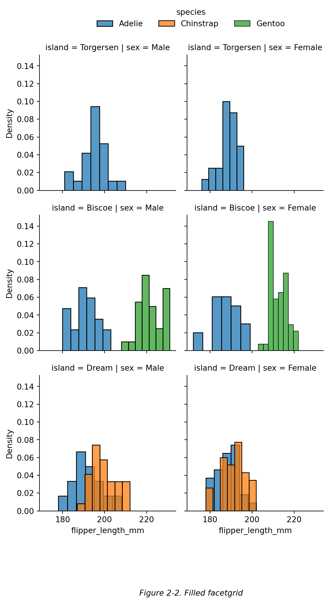 如 Figure 2-2,我们创建了一个分面网格,包含根据 鳍长 范围区间不同绘制了若干直方图,且按照 岛屿 不同进行了分行,按照 性别 不同进行了分列,按照 种类 不同进行了分色。由此可见,通过分行和分列,我们可以额外增加两个离散型变量;同时,通过区分颜色,可以再增加一个离散型变量。