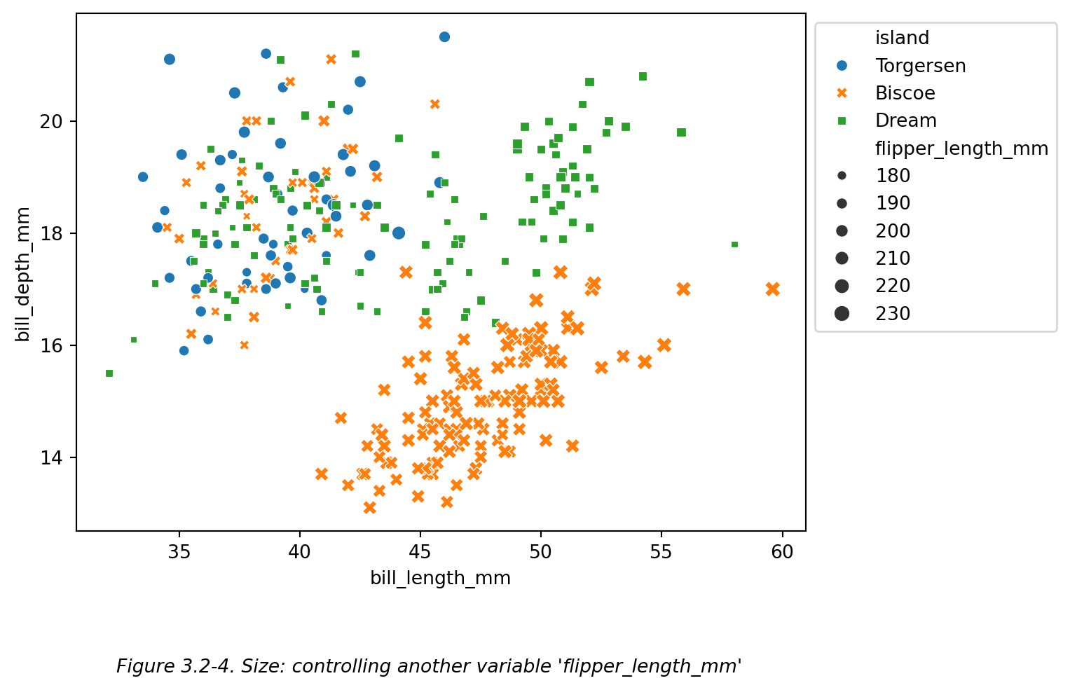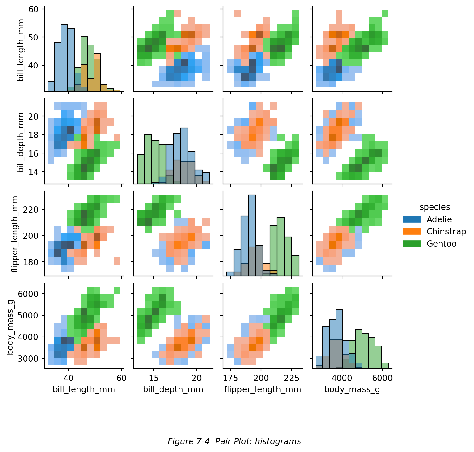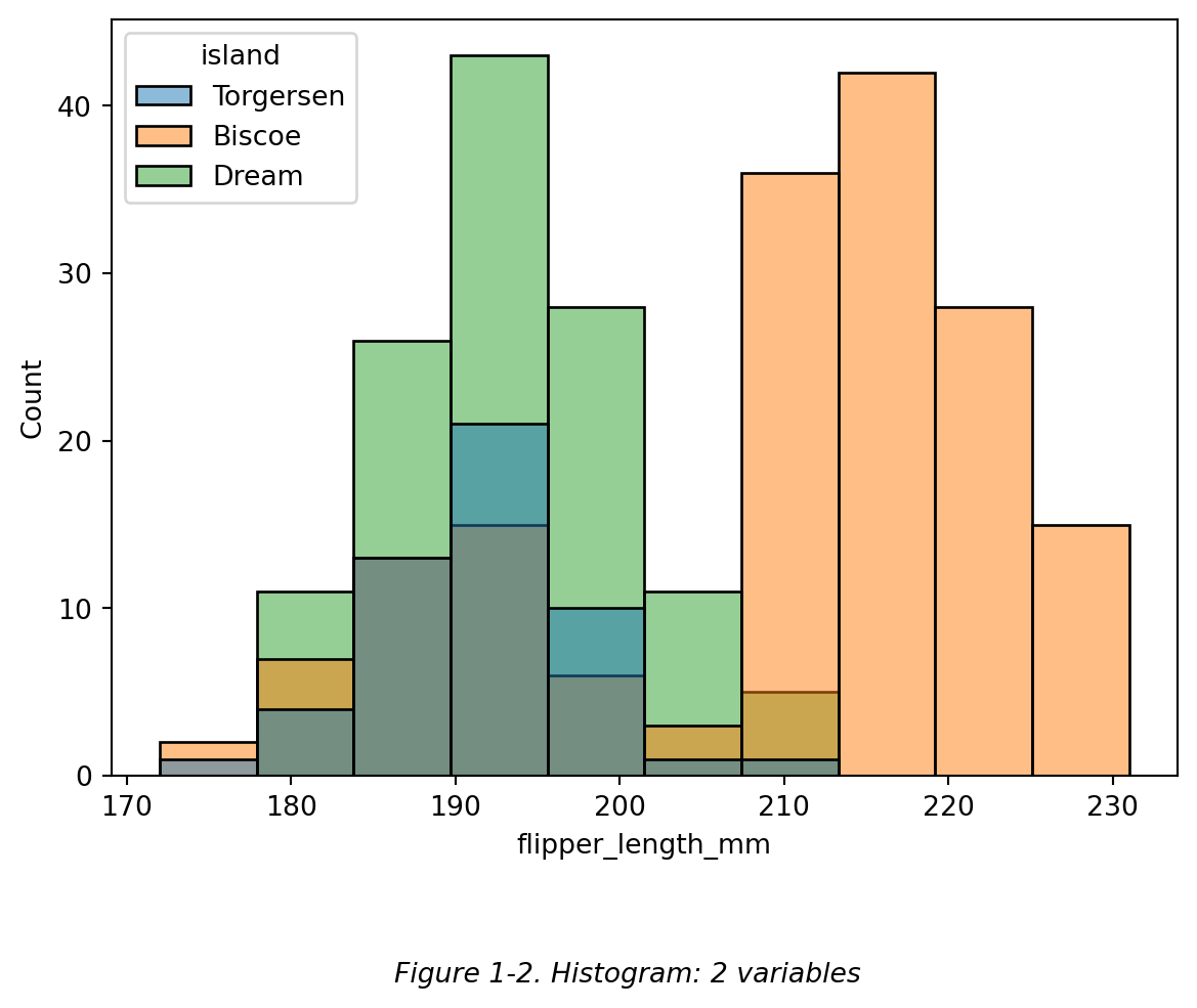 然而,有的图表类型不支持同时设置 x , y 和 hue 参数 来展示三个变量。比如直方图中,只支持 x 和 hue 参数的设置,见 Figure 1-2。直方图中 x 轴 和 y 轴展示的都是 ‘flipper_length_mm’ (鳍长)这个变量,x轴 展示的是鳍长的分布区间,y轴 展示的在鳍长的每个区间内,企鹅的量。因此这个直方图中只有两个变量(即原 dataframe 中的两个列)。