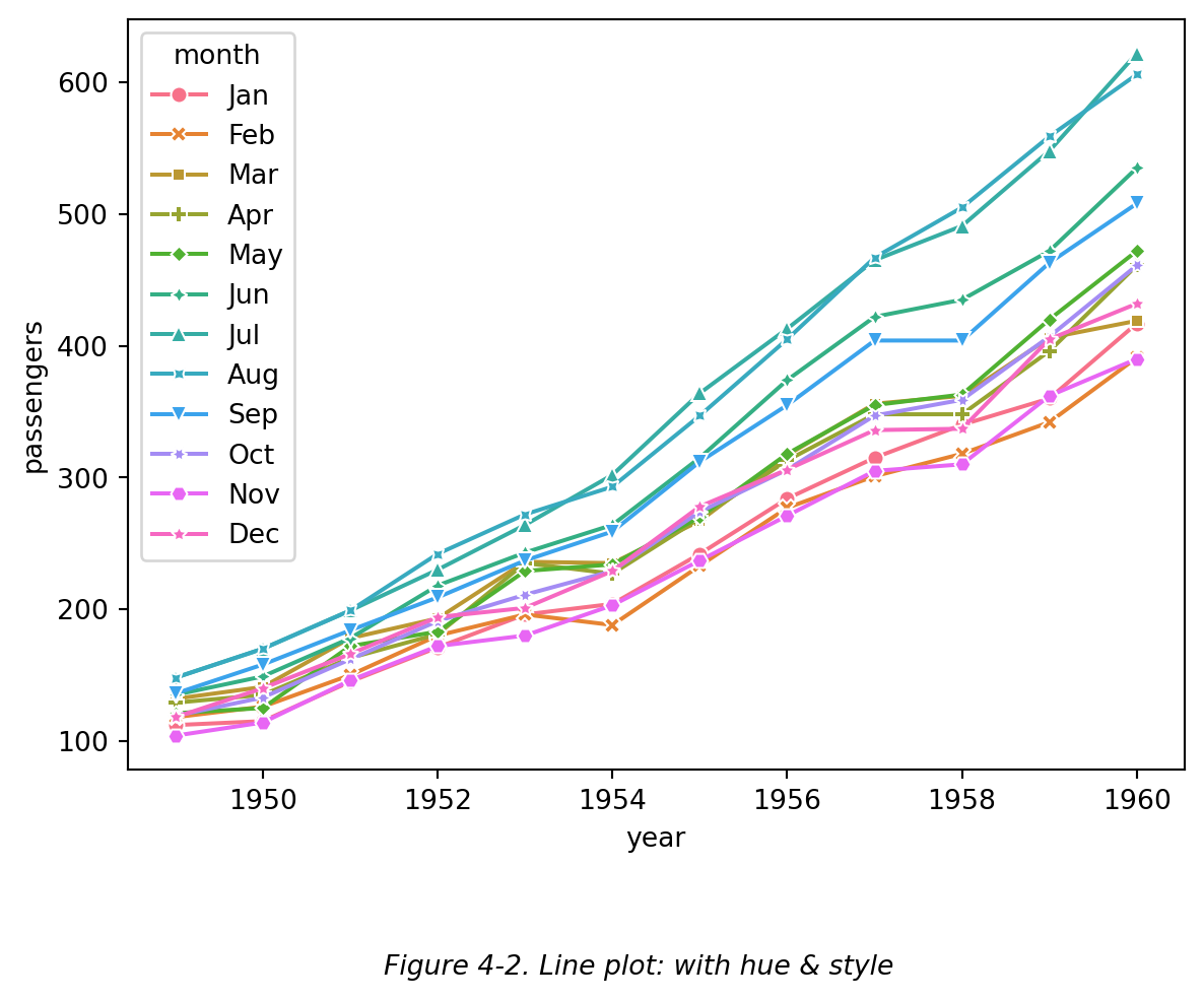 plt.figtext(0.5,-0.1,"Figure 4-2. Line plot: with hue & style",ha="center",fontsize=10,style='italic')