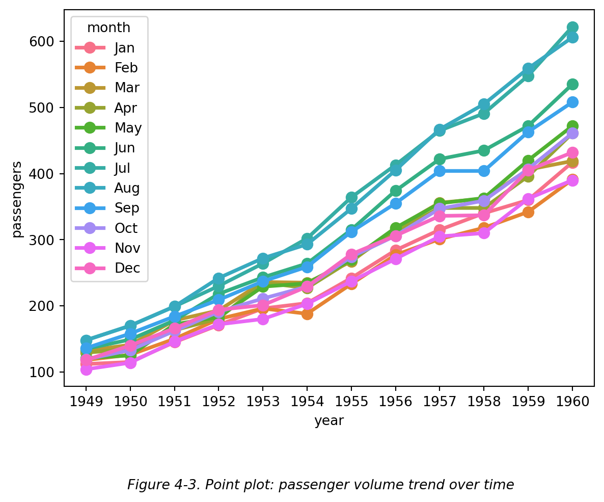 plt.figtext(0.5,-0.1,"Figure 4-3. Point plot: passenger volume trend over time",