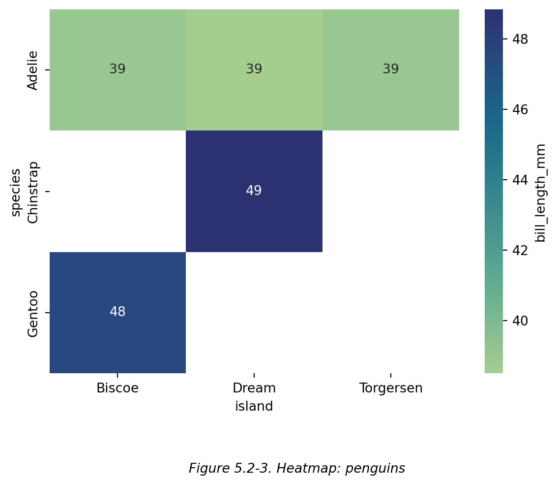 plt.figtext(0.5,-0.1,"Figure 5.2-3. Heatmap: penguins",ha="center",fontsize=10,style='italic')