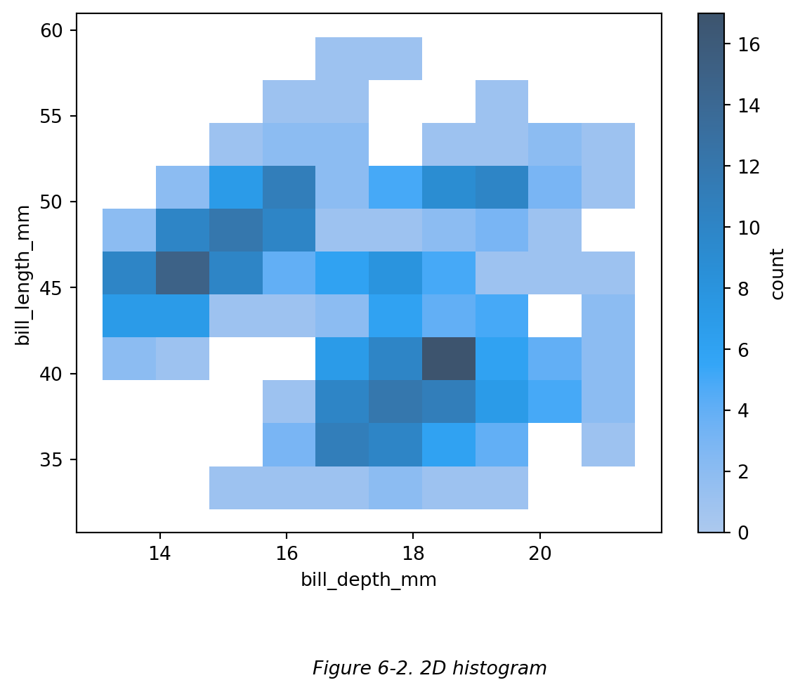 此时,我们可以改用 **二维直方图/2D直方图 (2-dimenl histogram)**,而不是绘制单个点(散点图)。二维直方图将整个 x - y 平面细分为小矩形,每个矩形是一个分箱 (bin),并计算落入每个分箱的数据量,然后按照数据量的大小对矩形进行着色。如下图 (Figure 6-2):