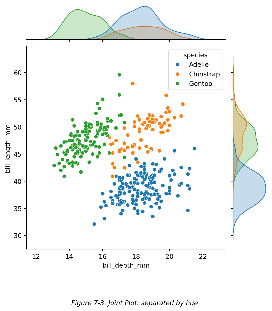 plt.figtext(0.5,-0.1,"Figure 7-3. Joint Plot: separated by hue",ha="center",fontsize=10,style='italic')