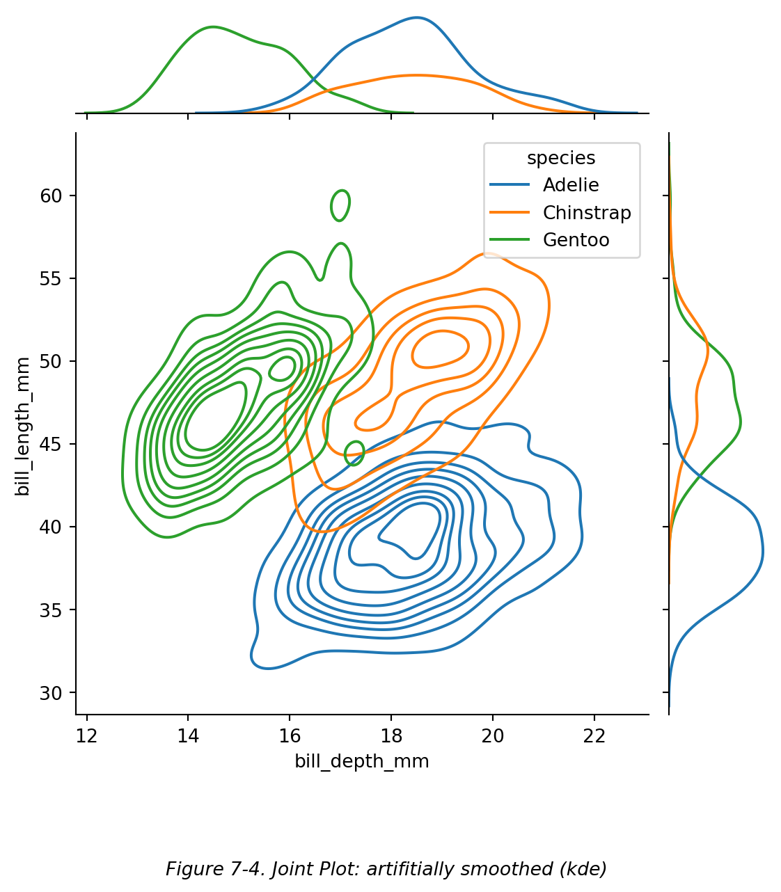 还可以通过设置参数 `kind='kde'` (abbr. 'kernal density estimation') 来生成自动光滑化的分布曲线,如下图 (Figure 7-4)。但是由于光滑化后的曲线并非真实数据,可能会误导读者,尤其是当数据点量非常少的时候。因此不建议在本课程中使用。