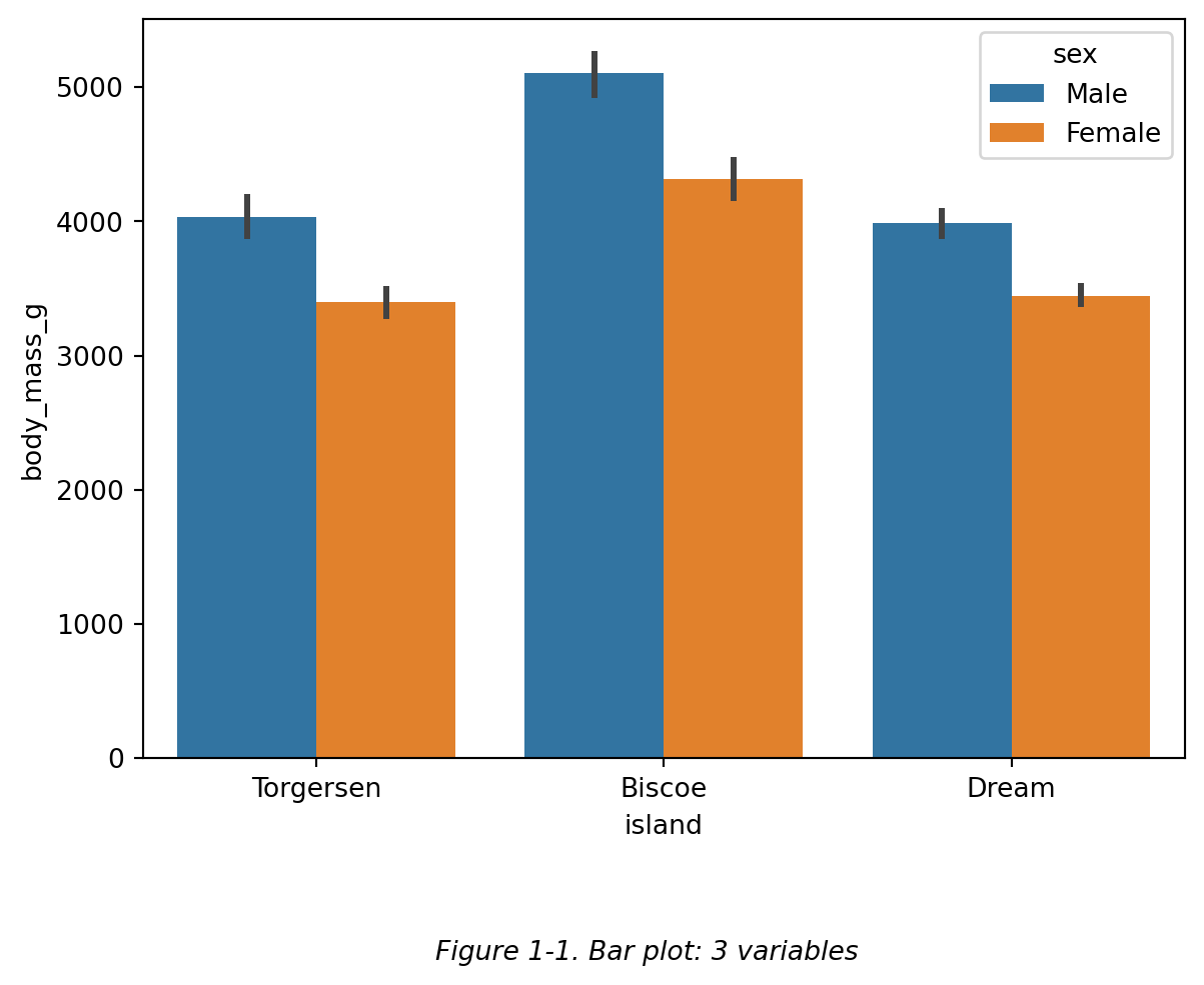 根据之前学过的柱状图画法,除了 x, y 两个变量之外,我们还可以设置 hue 参数 ,从而实现绘制一个包含三个变量的柱状图。比如下图 Figure 1-1 中包含了 'island' , 'bogy_mass_g' , 'sex' 三个列的数据,即,三个变量的数据。