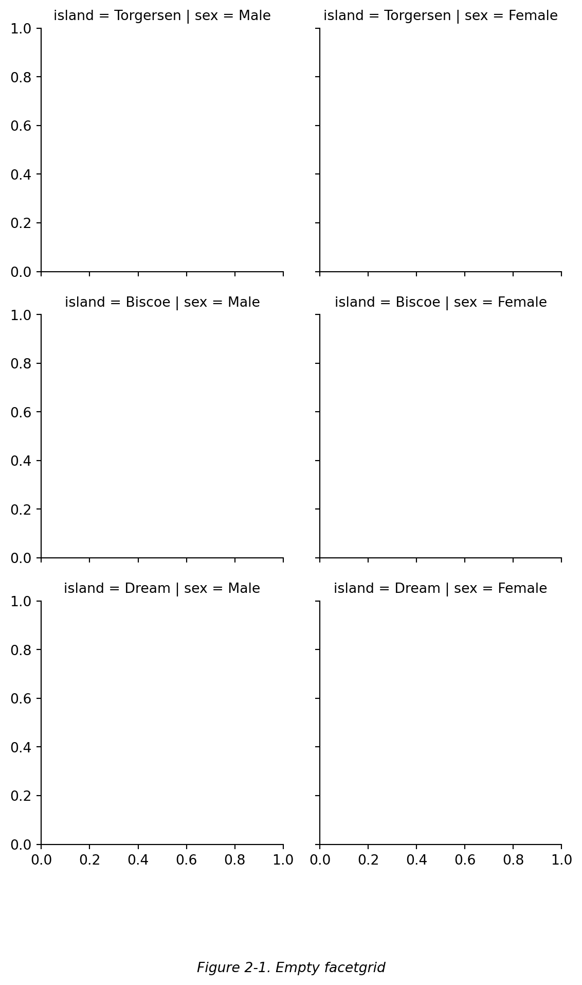如 Figure 2-1,通过定义 g = sns.FacetGrid(data=df,col='sex',row='island') ,我们创建了一个包含许多小图表的网格。